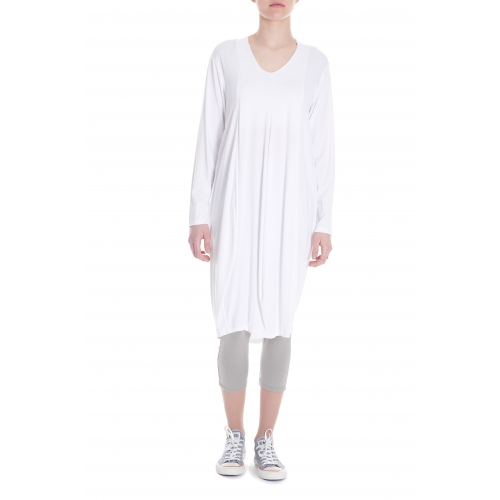 Long sleeved V-neck dress (below the knee). Lantern bubble shaped with a comfortable loose fit. Suitable for any day or night occasion.